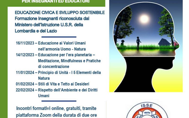 The training course designed by the ISSE SE of Italy for teachers and educators in public schools and launched in 2021, is associated to Civic Education and Sustainable Development and has been accredited by the Italian Ministry of Education and Merit. This year it will continue with the 3rd Unit, relating to the Harmony between Man and Nature, and Human Values ​​for the Planet. The course will be held in Italian.